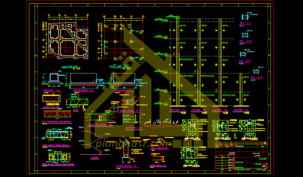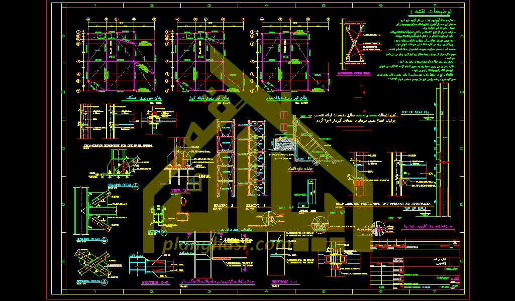نقشه سازه فلزی (فایل نقشه آتوکد . dwg) نقشه پی (فونداسیون) و اسکلت به همراه جزئیات اجرایی تیر و ستون و پی -بادبندها – پلان تیر ریزی طبقات و…