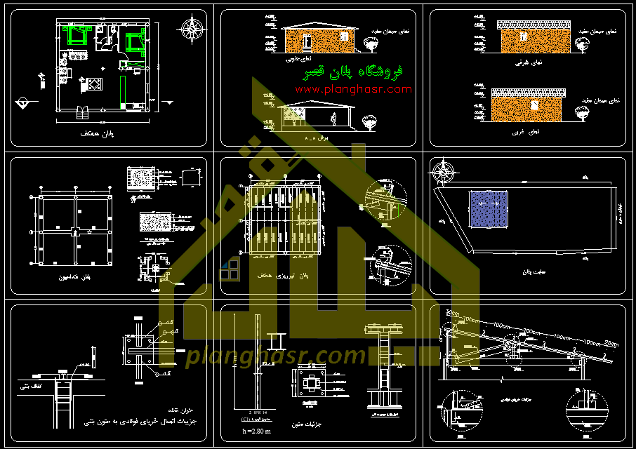 نقشه سازه خانه ویلایی 100 متری فوق به صورت بتنی با سقف شیروانی و خرپا فولادی که جزئیات نحوه اتصال سقف خرپا فولادی به بتنی در نقشه ها می باشد، حتی در سازه دیوار ها هم به صورت دیوار حمال اجرا می شود . نقشه خانه 10*10 ویلایی دارای 16 شیت نقشه می باشد .