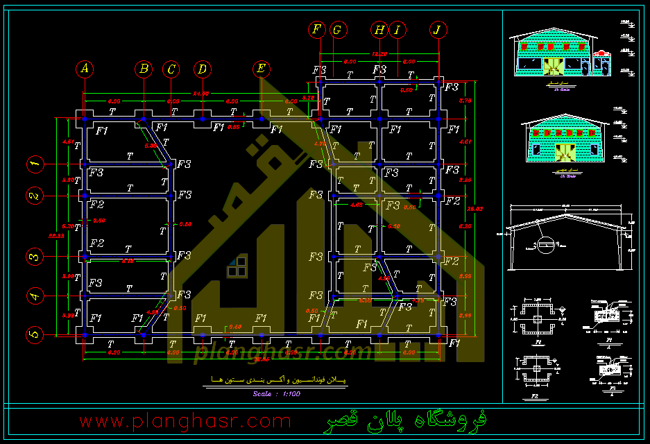 نقشه معماری (فایل نقشه اتوکد . dwg) شامل پلان موقعیت ، نقشه ستونگذاری، نقشه اندازه گذاری ،  برش ، نما شمالی و جنوبی